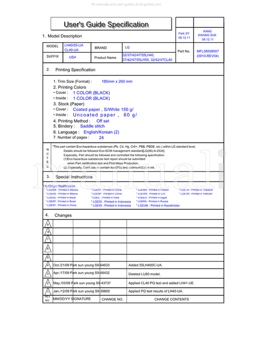 LG CL40-UA 185mm S9-48432 S9-43737 S9-39800 55LH40 55LH55 (29 pages) TV Operating Manual