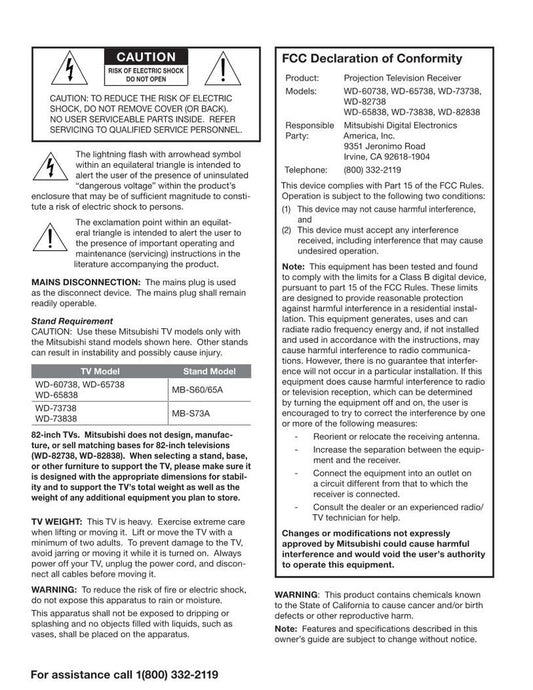 Mitsubishi WD60738 WD65738 WD65838 TV Operating Manual