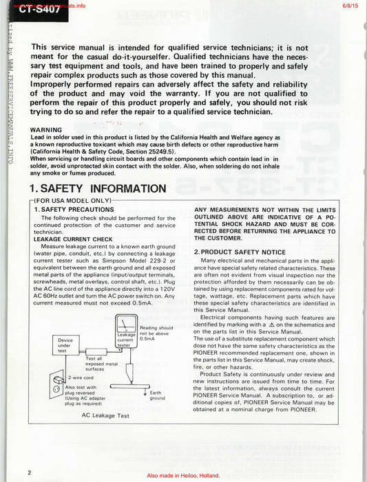 Pioneer CT-337, CT-337-S & CT-S407 Stereo Cassette Tape Deck Service Manual (Pages: 25)