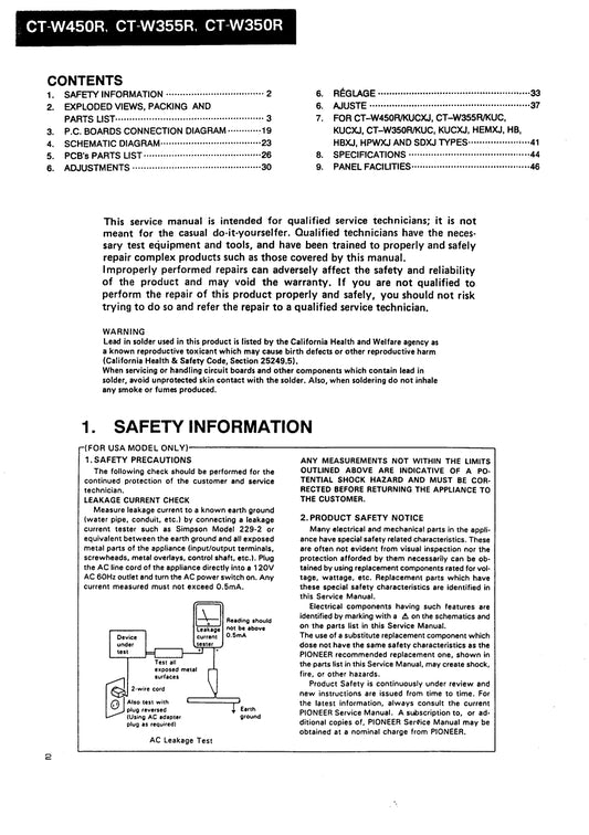 Pioneer CT-W350R, CT-W355R & CT-W450R Stereo Cassette Tape Deck Service Manual (Pages: 28)
