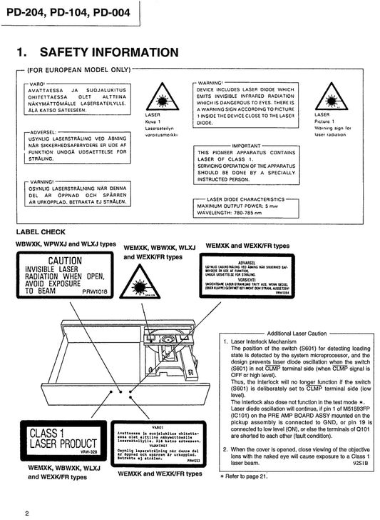 Pioneer PD-004, PD-104 & PD-204 CD Player Owner & Service Manual (Pages: 38)