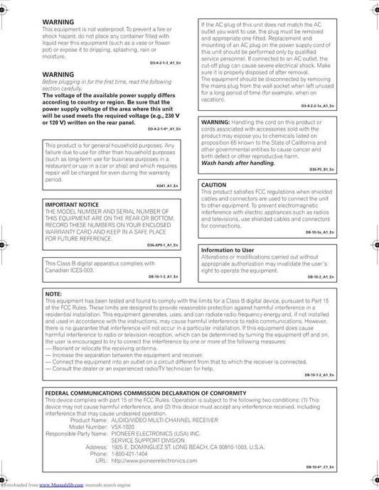 Pioneer VSX-1020 Audio/Video Receiver Operating Manual