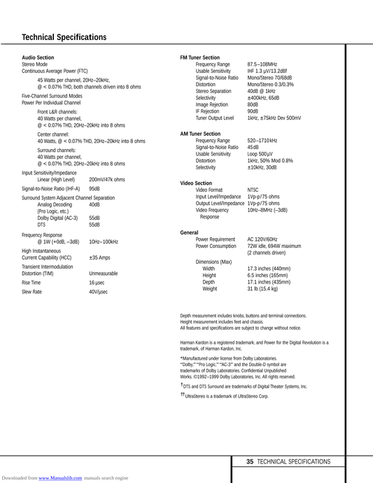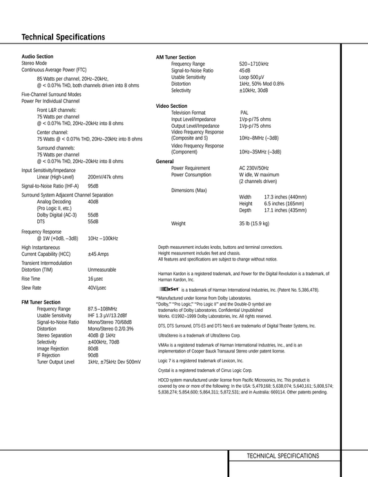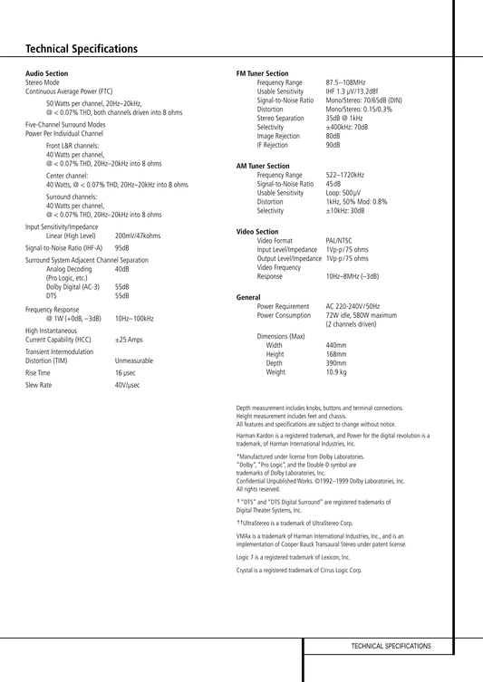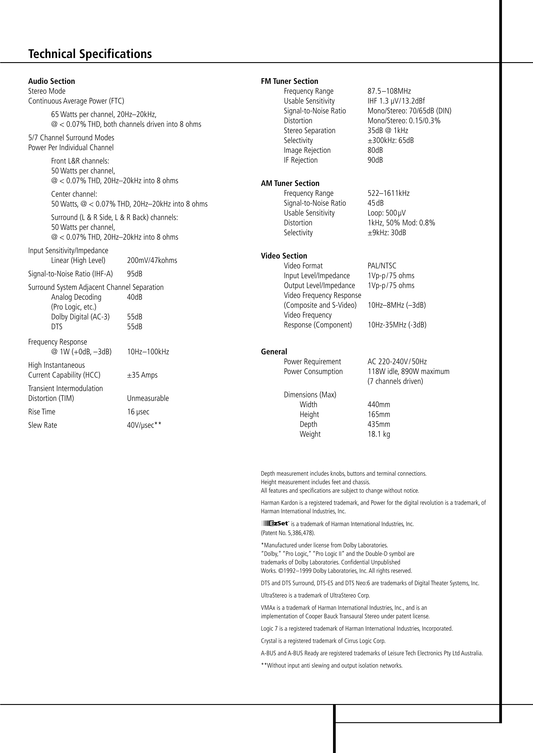 Harman/ Kardon AVR5 Audio/ Video Receiver Owner/ User Manual (Pages: 40)