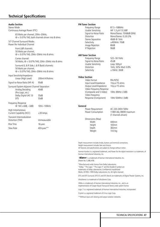 Harman/ Kardon AVR 7000 Audio/ Video Receiver Owner/ User Manual (Pages: 52)