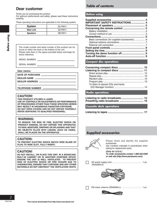 Panasonic SAPM11 Audio System Operating Manual