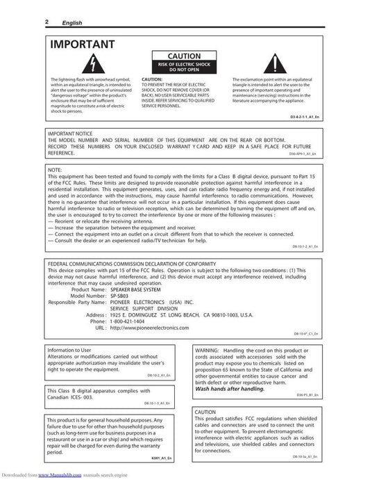 Pioneer SP-SB03 Audio System Operating Manual