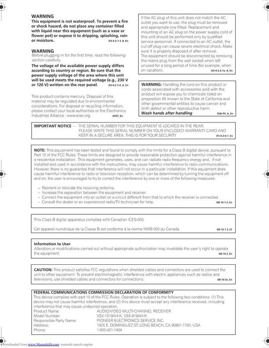 Pioneer VSX1019 AHK Audio/Video Receiver Operating Manual