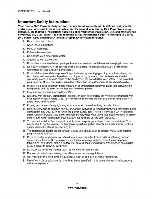 Vizio VBR231 Blu-Ray DVD Player Operating Manual