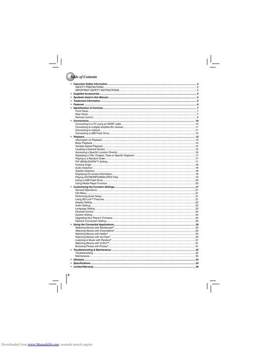 Discover comprehensive Blu-ray Player Service and Operating Manuals at Manuali. Our collection covers top brands, offering detailed guidance for setup, operation, troubleshooting, and maintenance. Whether you're configuring your system or enhancing playback, explore our manuals for essential insights and support.