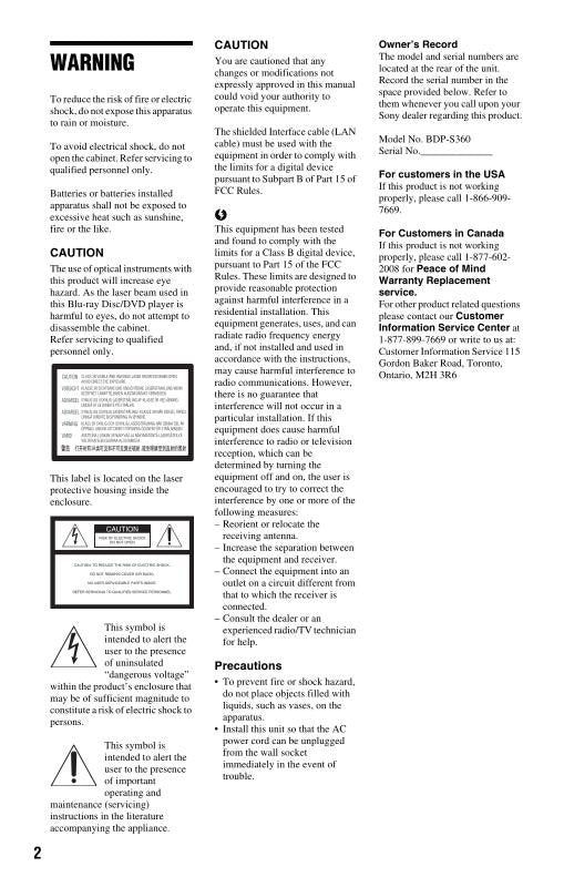 Sony BDPS360 Blu-Ray DVD Player Operating Manual