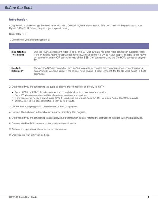 Verizon Motorola QIP7100-P2 Hybrid QAM/IP High-definition Set-top Cable Box Operating Manual