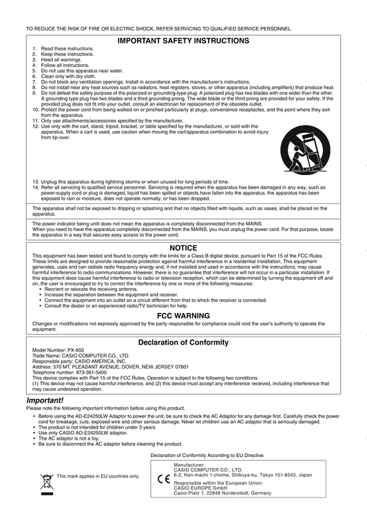 Casio PX-850 Keyboard Piano Owner's/ User Manual (Pages: 56)