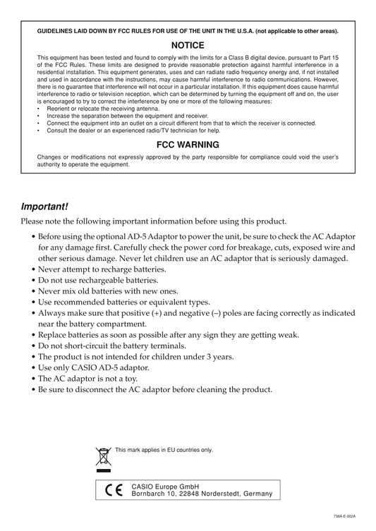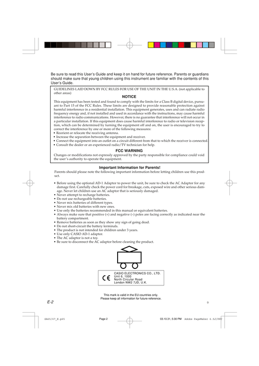 Casio SA-65 & SA-67 Keyboard Piano Owner's/ User Manual (Pages: 18)