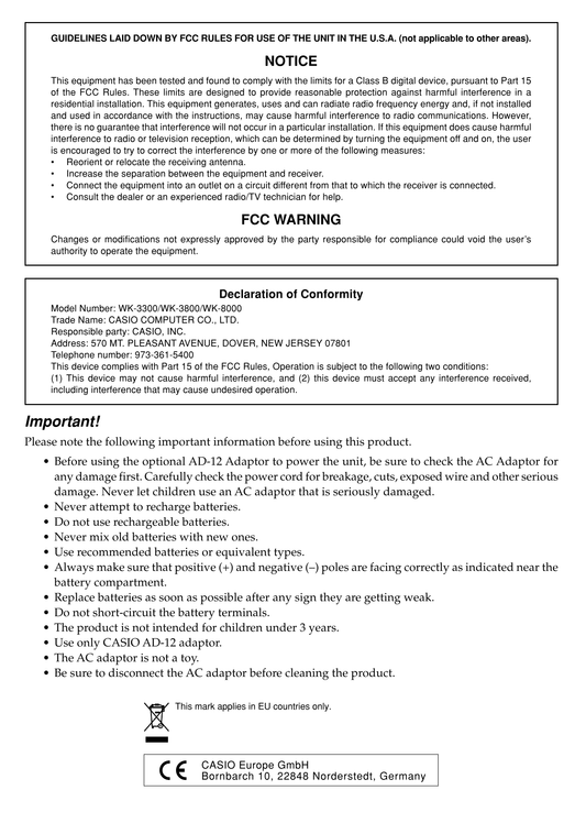 Casio WK-3300, WK-3800 & WK-8000 Keyboard Piano Owner's/ User Manual (Pages: 108)