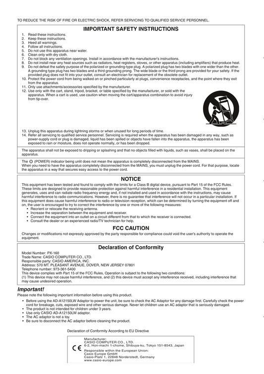 Casio PX-160 Keyboard Piano Owner's/ User Manual (Pages: 38)