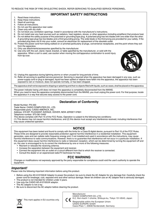 Casio PX-330 Keyboard Piano Owner's/ User Manual (Pages: 72)