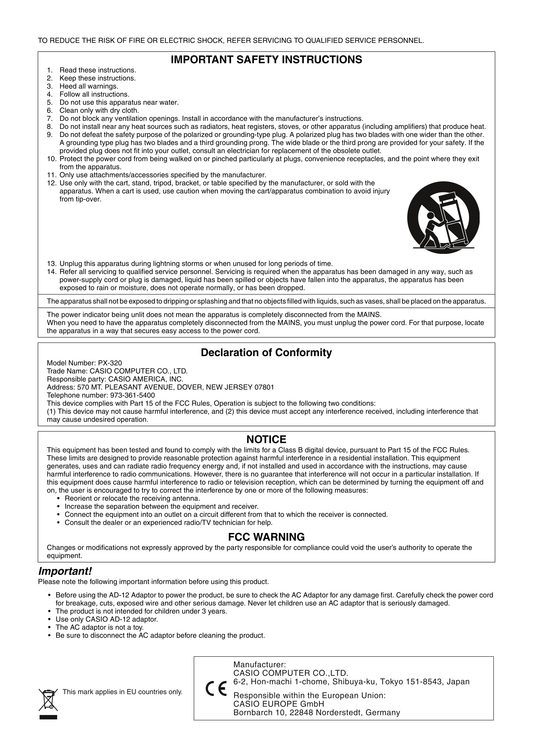 Casio PX-320 Keyboard Piano Owner's/ User Manual (Pages: 62)
