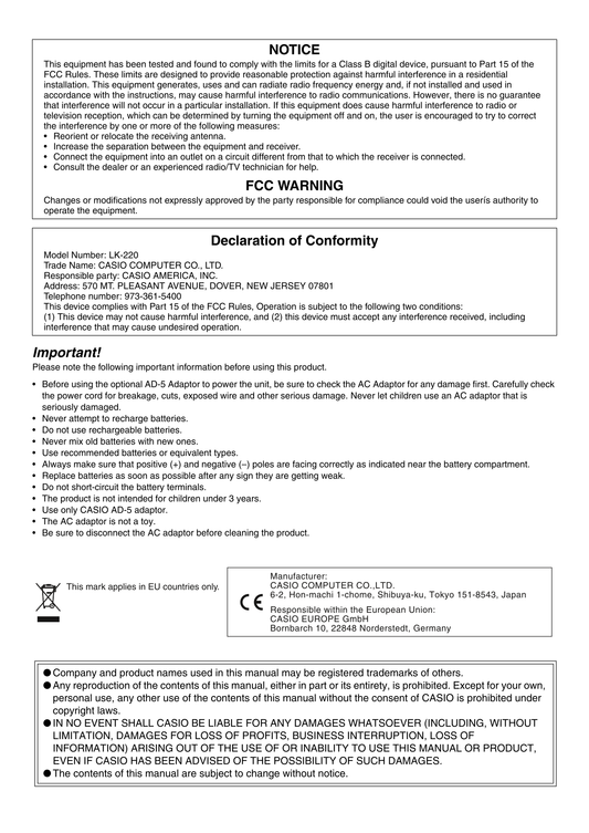 Casio LK-220 Keyboard Piano Owner's/ User Manual (Pages: 45)