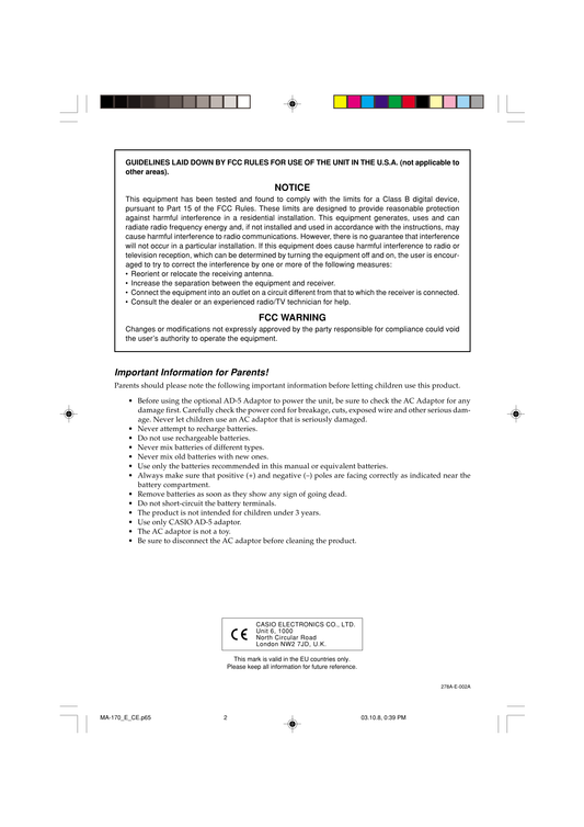 Casio MA-170 Keyboard Piano Owner's/ User Manual (Pages: 43)