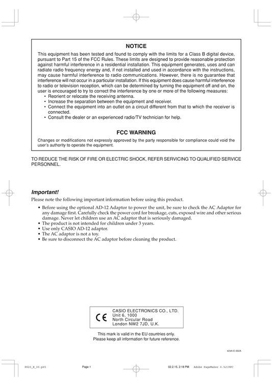 Casio PX-120 Keyboard Piano Owner's/ User Manual (Pages: 38)