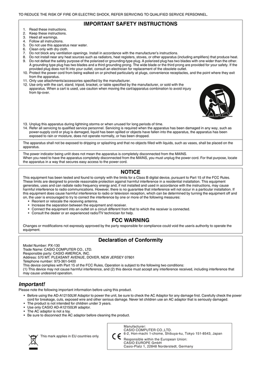 Casio PX-130 Keyboard Piano Owner's/ User Manual (Pages: 36)