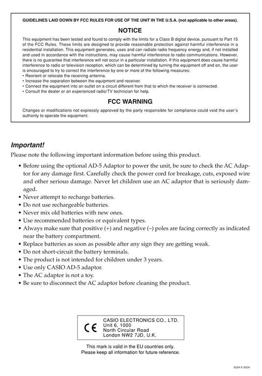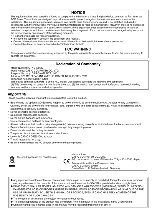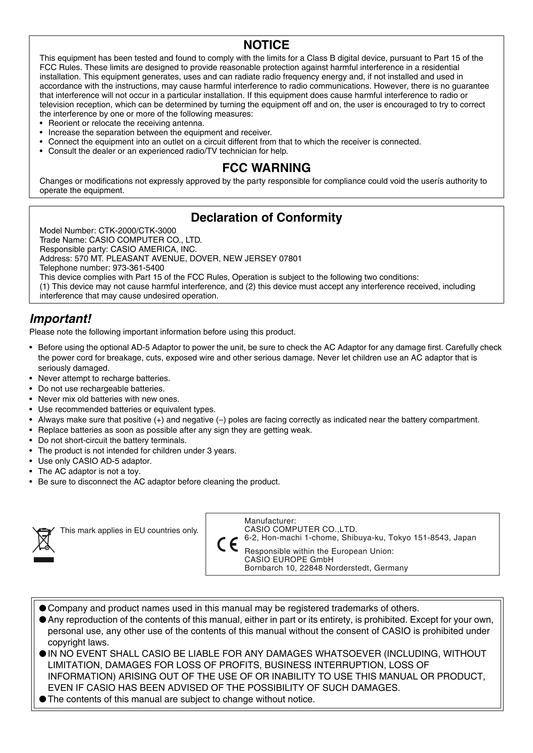 Casio CTK-2000 & CTK-3000 Keyboard Piano Owner's/ User Manual (Pages: 46)
