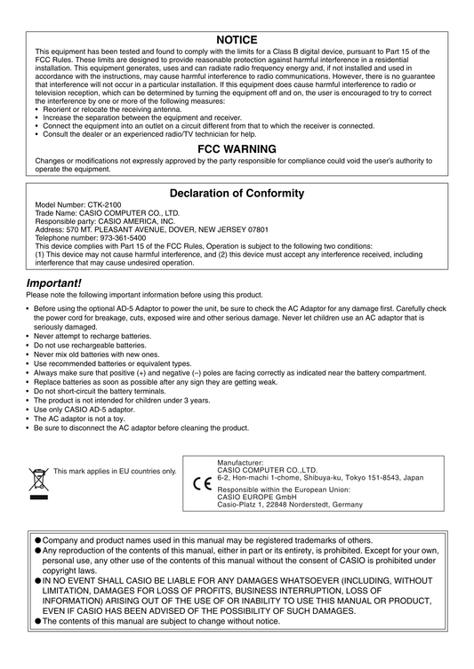 Casio CTK-2100 Keyboard Piano Owner's/ User Manual (Pages: 46)