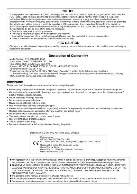 Casio CTK-2500 & CTK-2550 Keyboard Piano Owner's/ User Manual (Pages: 36)