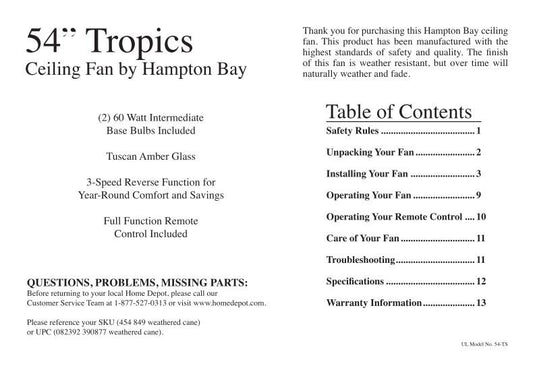Hampton Bay 454849OM Ceiling Fan Operating Manual
