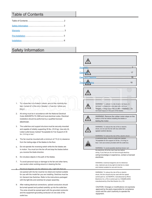 Find and download or order hard copy manuals for ceiling fans at Manuali. Choose from detailed PDF guides or binded copies for installation, troubleshooting, and maintenance to keep your ceiling fans running smoothly. Enjoy instant access to essential information for optimal performance. Browse our collection now!
