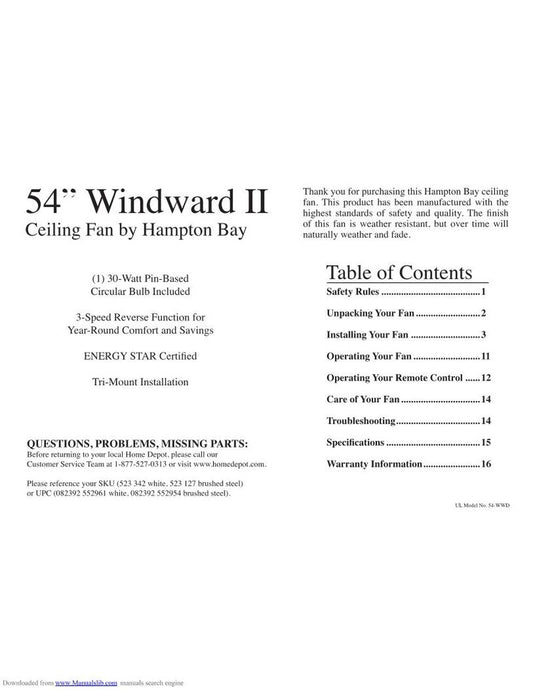 Hampton Bay 523127 Windward II 54 in Ceiling Fan Operating Manual