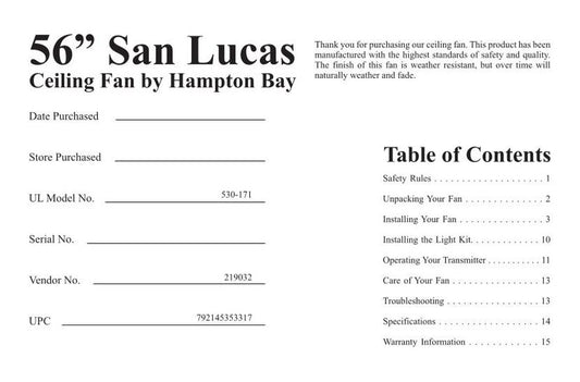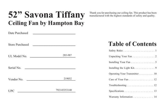 Hampton Bay 91661 Windward IV 52inch Ceiling Fan 91662 Operating Manual