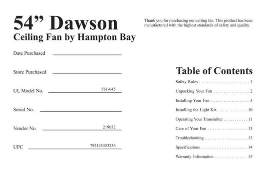 Hampton Bay AC426 Dawson 54 in. Ceiling Fan Operating Manual
