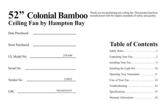 Hampton Bay AC375 Colonial Bamboo 52 in. Ceiling Fan Operating Manual