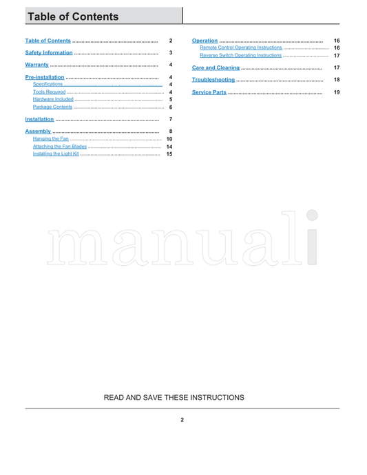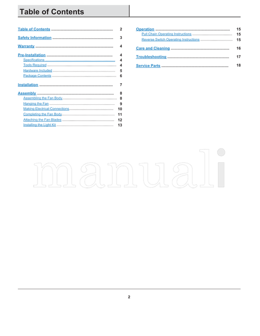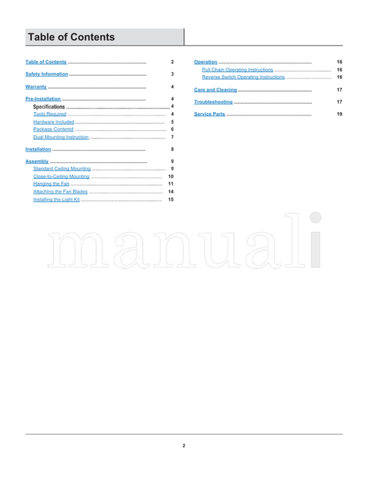 Find and download or order hard copy manuals for ceiling fans at Manuali. Choose from detailed PDF guides or binded copies for installation, troubleshooting, and maintenance to keep your ceiling fans running smoothly. Enjoy instant access to essential information for optimal performance. Browse our collection now!