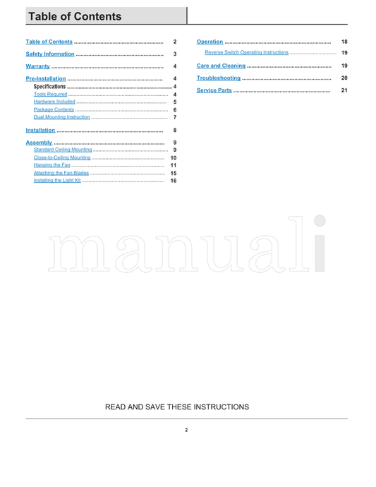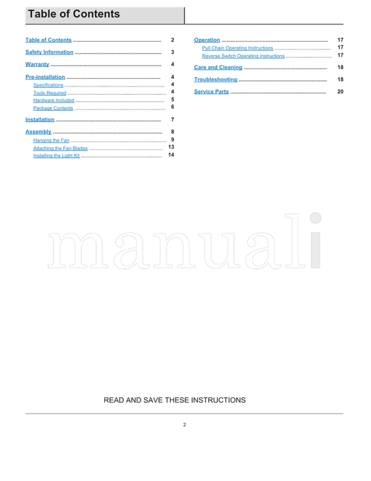 Find and download or order hard copy manuals for ceiling fans at Manuali. Choose from detailed PDF guides or binded copies for installation, troubleshooting, and maintenance to keep your ceiling fans running smoothly. Enjoy instant access to essential information for optimal performance. Browse our collection now!