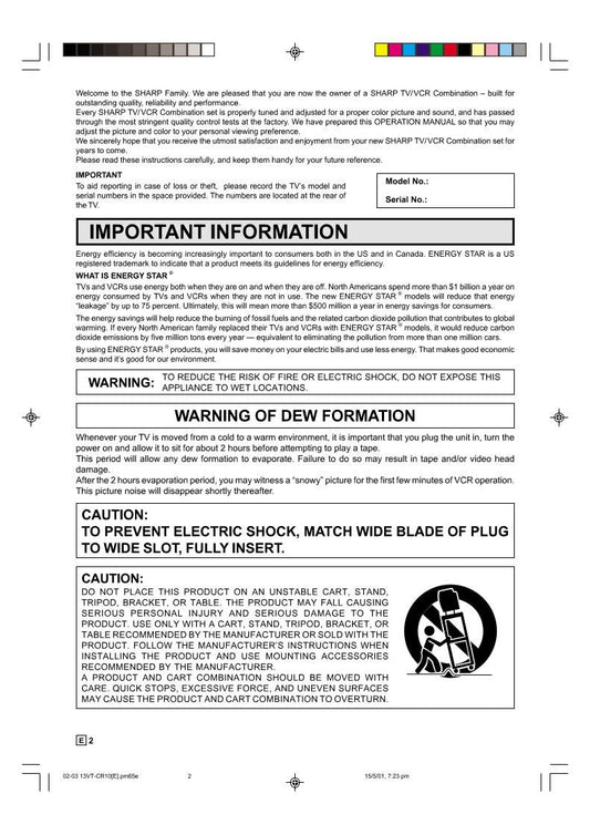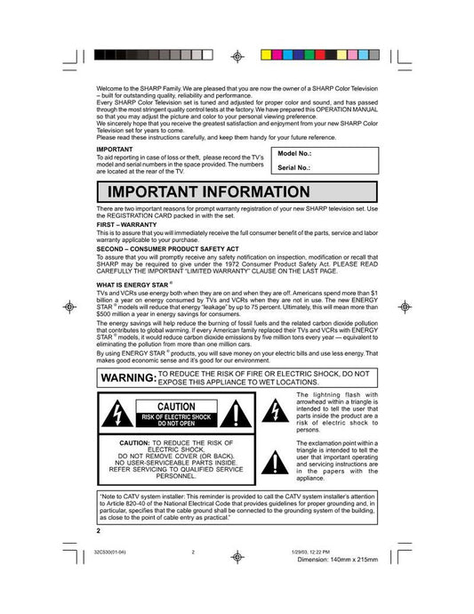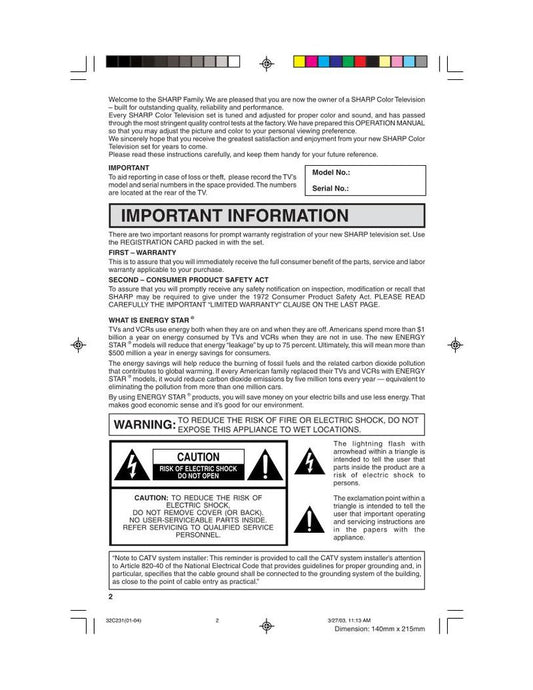 Sharp 32C230 32C231 36C230 Consumer Electronics Operating Manual