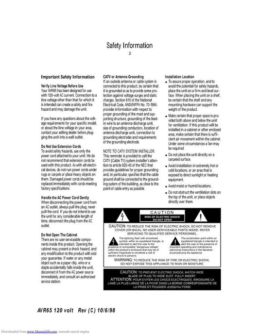 Denon AVR65 Audio/Video Receiver Operating Manual