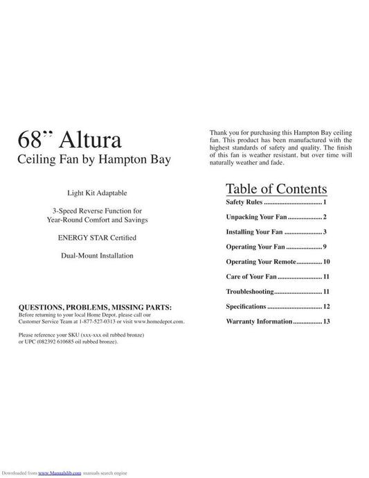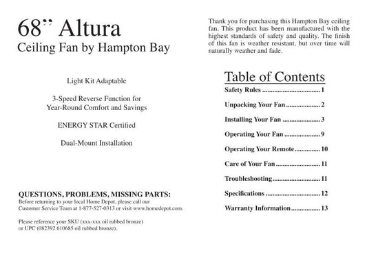 Hampton Bay 68 ATR Altura in Ceiling Fan Operating Manual