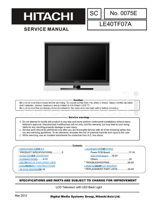 Hitachi 0075E LE40TF07A (41 pages) TV Service Manual