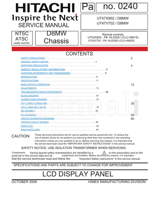 Hitachi SM00001 SM00002 UT47X902 UT47V702 (96 pages) TV Service Manual