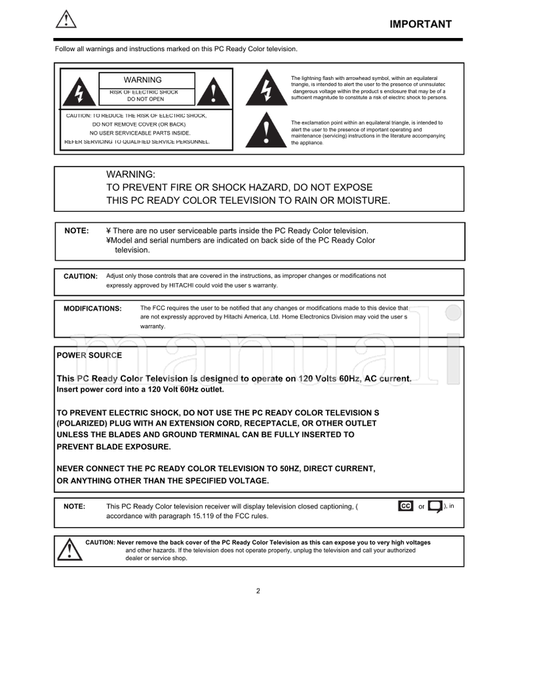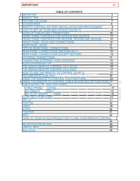 Explore Hitachi home audio, video, and TV service and operating manuals, available as downloadable PDFs and binded copies. Our detailed guides provide comprehensive setup instructions, troubleshooting tips, and maintenance advice to ensure the optimal performance of your Hitachi devices. Browse our collection today to find the perfect manual for your model.