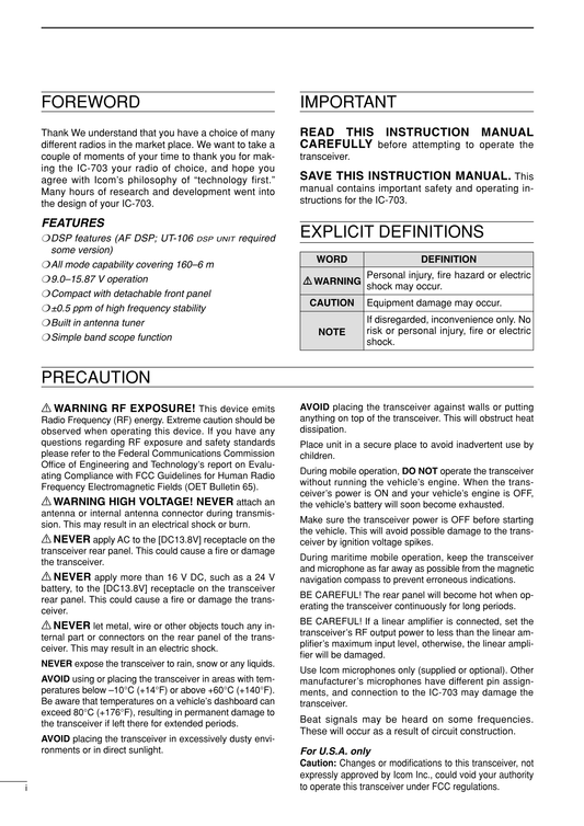 Icom IC-703 HF/50 MHz All Mode Transceiver Owner/ User Manual (Pages: 112)