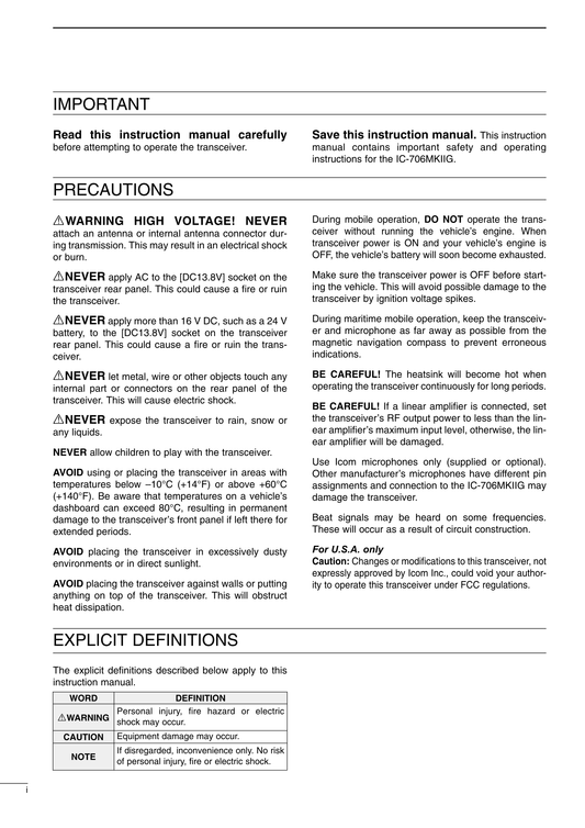 Icom IC-706 MKIIG HF/VHF/UHF All Mode Transceiver Owner/ User Manual (Pages: 75)