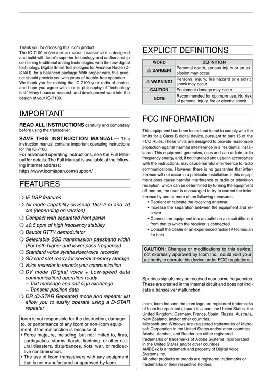 Icom IC-7100 All Mode Transceiver Owner/ User Manual (Pages: 96)