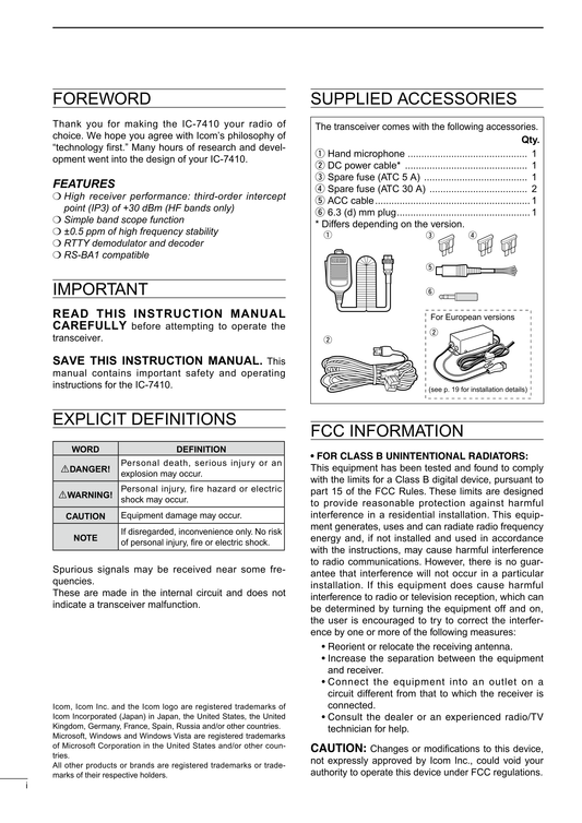 Icom IC-7410 HF/ 50 MHz Transceiver Owner/ User Manual (Pages: 124)