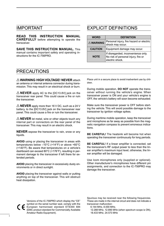 Icom IC-756 PRO All Mode Transceiver Owner/ User Manual (Pages: 84)
