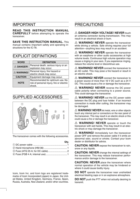 Icom IC-78 HF Transceiver Owner/ User Manual (Pages: 48)