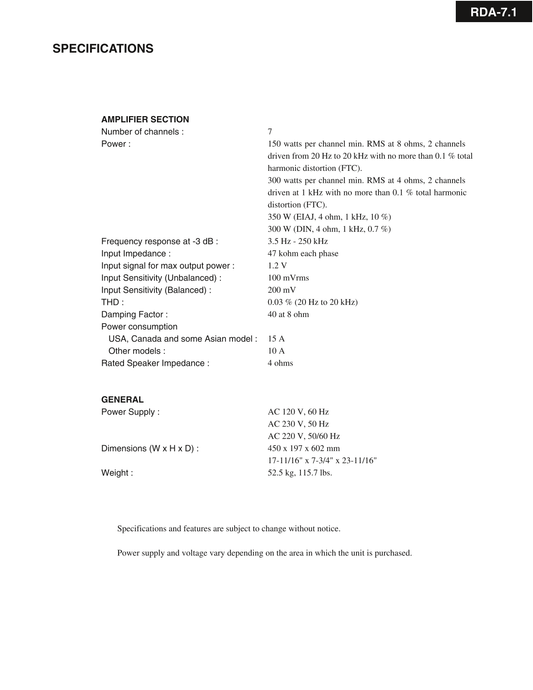 Integra RDA-7.1 Amplifier Service Manual (Pages: 29)