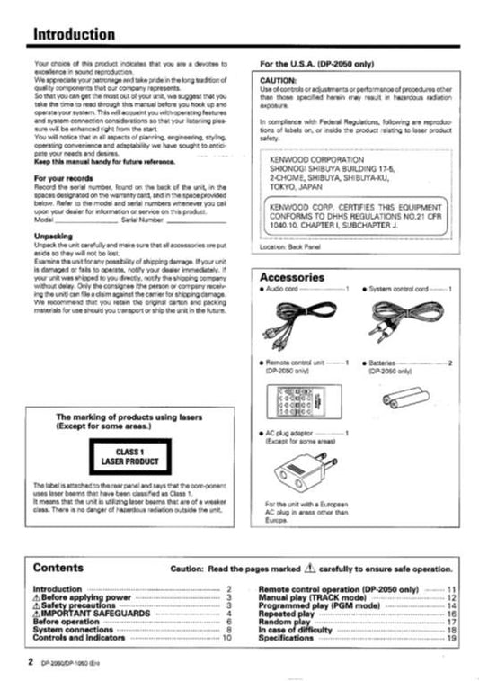 Kenwood DP1050 DP2050 Audio System Operating Manual